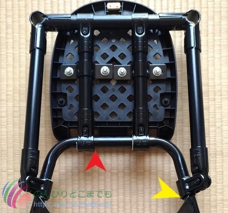 注意点ですが、下の図の黄色矢印の部分、グラブバーのステー接合部分にイレクターのジョイントを押し当てるのがポイントです。