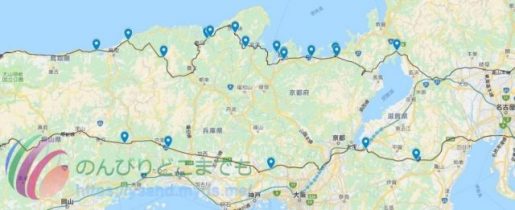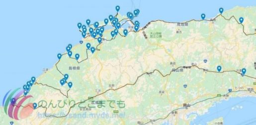 青いポイントが観光したポイントなので、鳥取県はほぼまともに観光してないです。