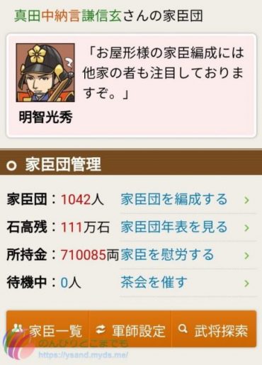 家臣団も1042人で家臣団クエストは残り1つです。
