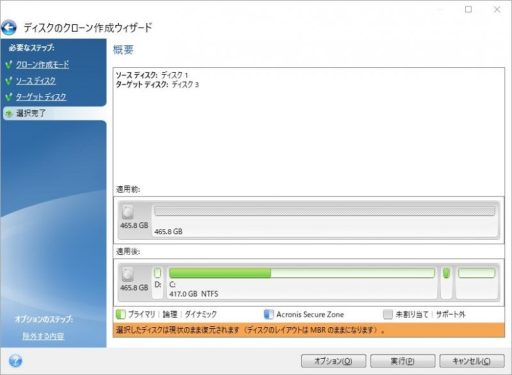 最初にソースディスクを選択(現在使用している起動ディスクを選択)します。自分の場合はサムソンですね。