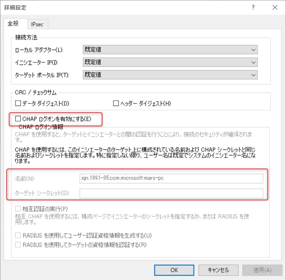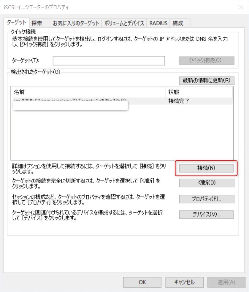 再起動したら、「iSCSI イニシエーター」を開いて「接続」を選びますが、名前とパスワードを設定している場合は必ず入力して接続してください。