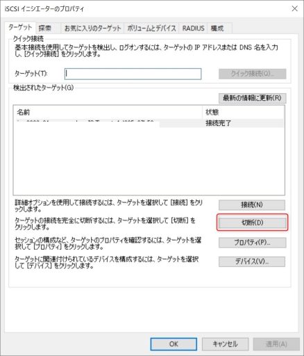 なので、「iSCSI イニシエーター」を開いて「切断」を押してからSynologyのシャットダウンをします。