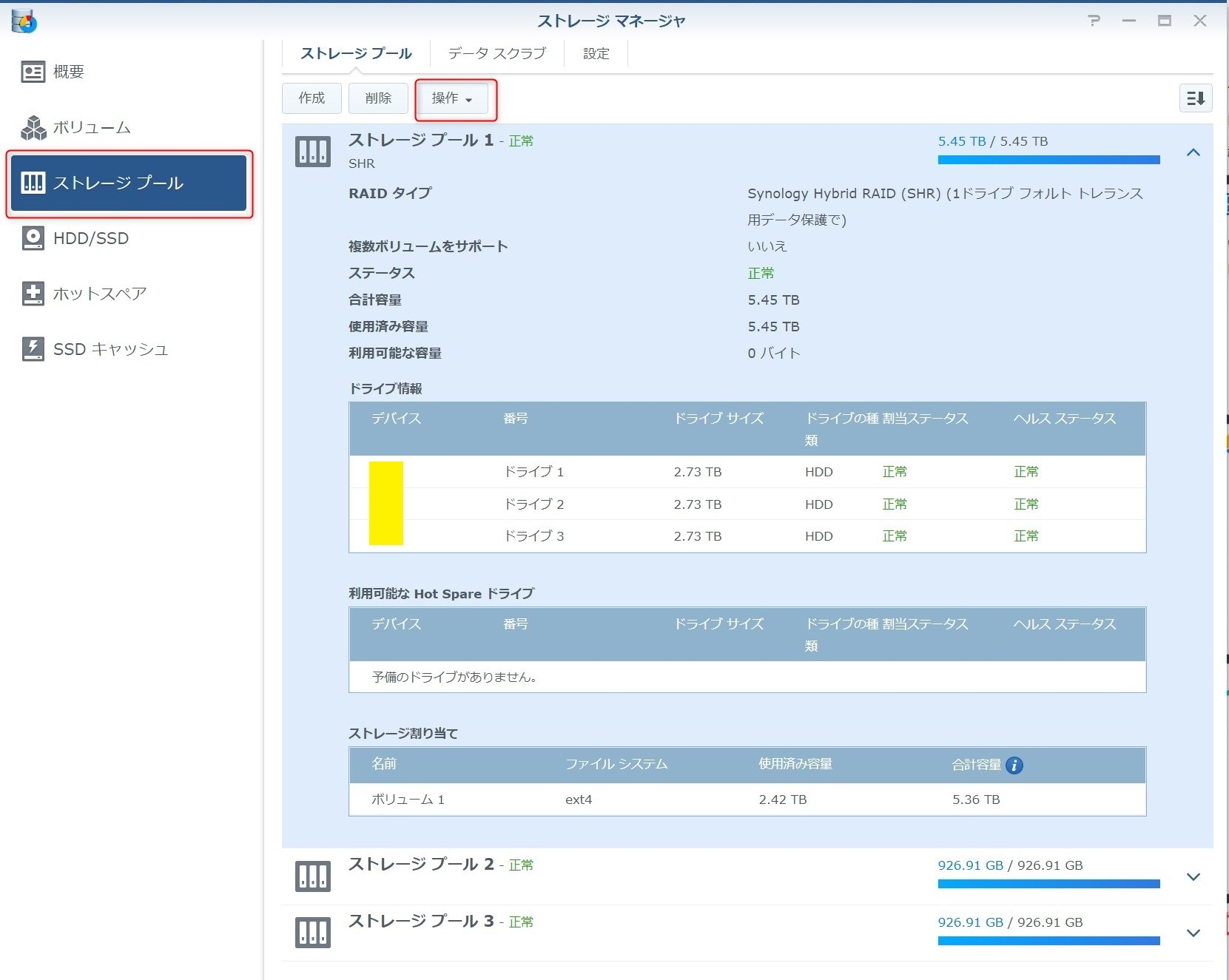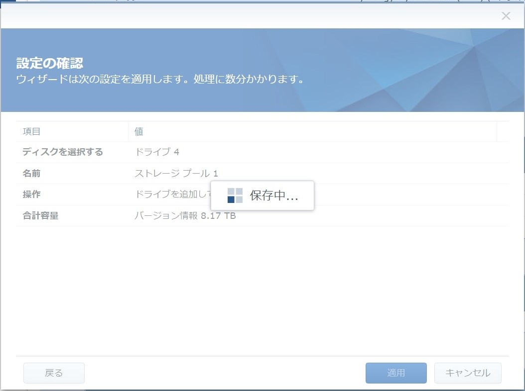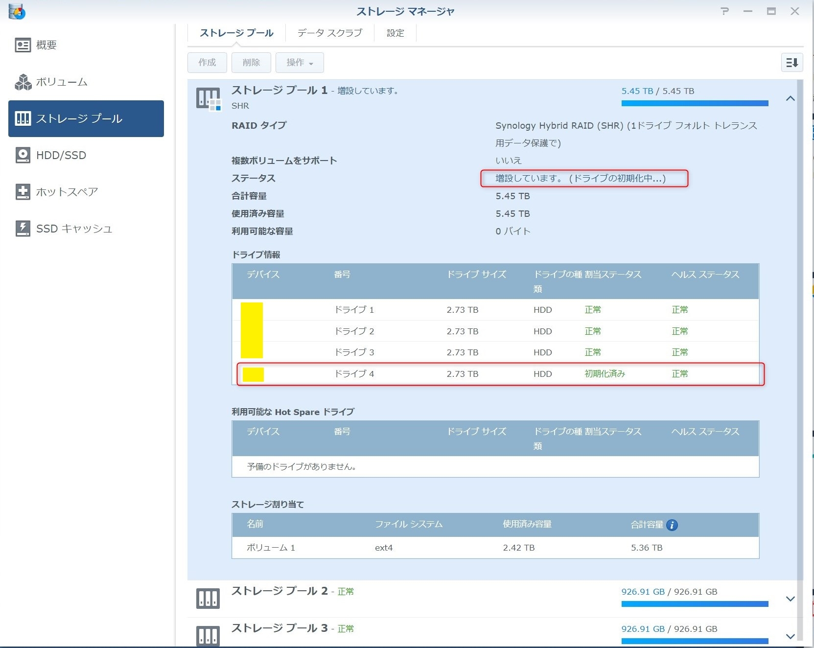 3TB、追加で4日掛かりました。まぁ、そこそこデータ量もあるし、データの分散させたり、パリティチェックしたりしているので、仕方ないですかね。