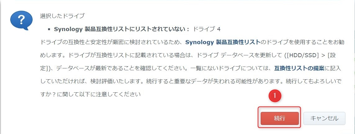 選択したドライブがSynologyで互換性テストをしていない製品なので表示されています。