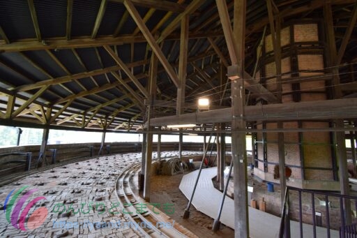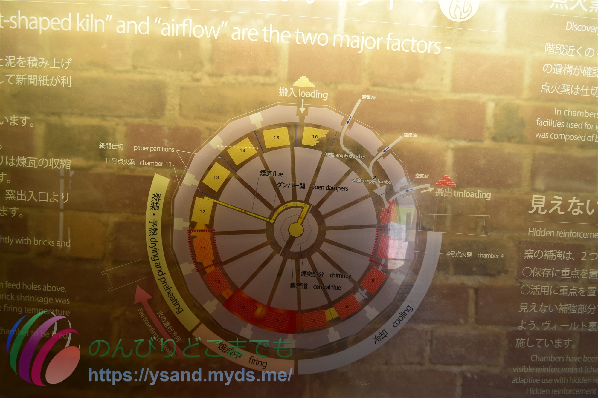 円状に16個の窯(部屋というと分かりやすいかな。)があり、一つの窯にレンガを詰めたら、閉鎖して、乾燥→余熱→焼成→冷却というサイクルで工程を経ていくとのこと。