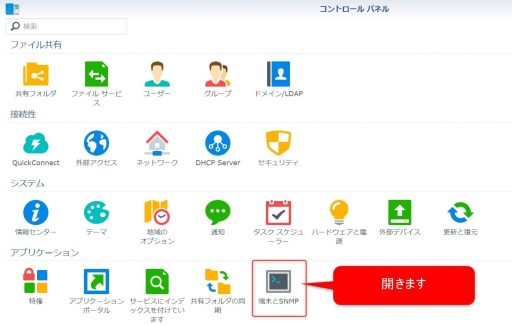 DS1621+のDSMに入って、コントロールパネル→端末とSNMPを開きます。
