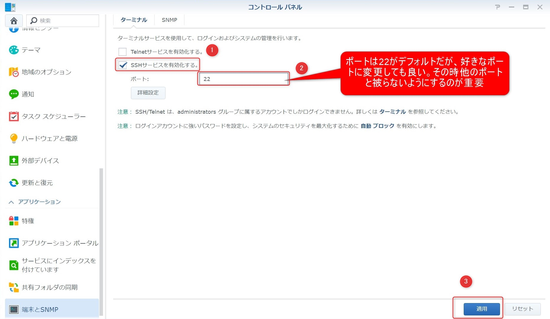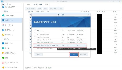 設定画面が開きますので、「SSHサービスを有効化」して、ポート「22」(デフォルトは22、それ以外でもOK、ただ、他のポートと被らないようにする)のままで、「適用」ボタンを押します。
