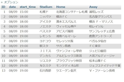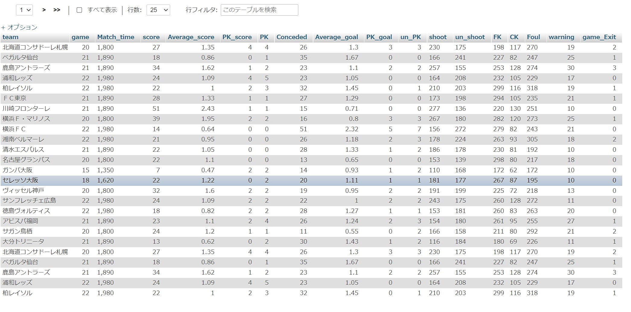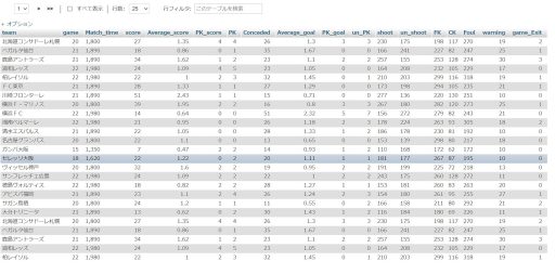 上の図の物は、Jリーグデータサイトから、チーム別集計結果のデータをMariaDBに反映させたものを表示しています。