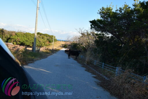 ノラの牛に道を塞がれる。左側の牧場から出てきている様子。