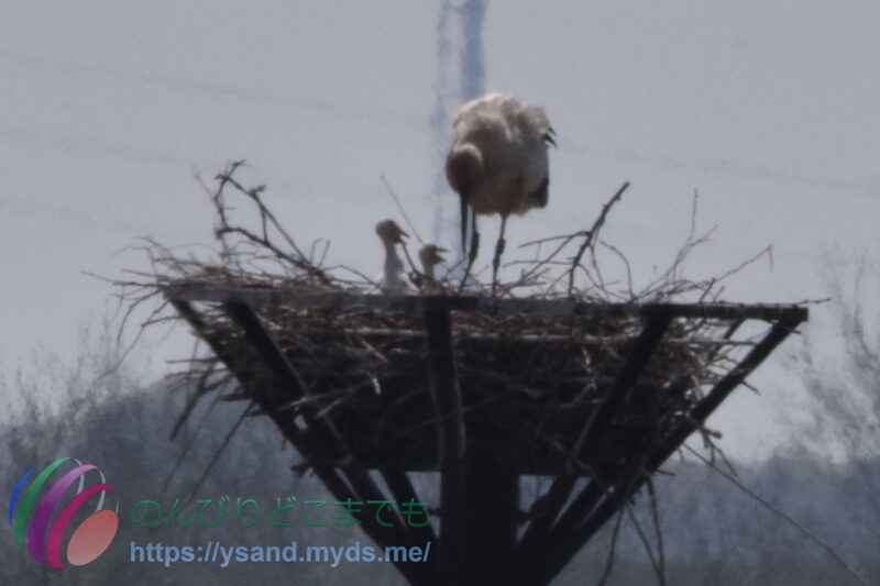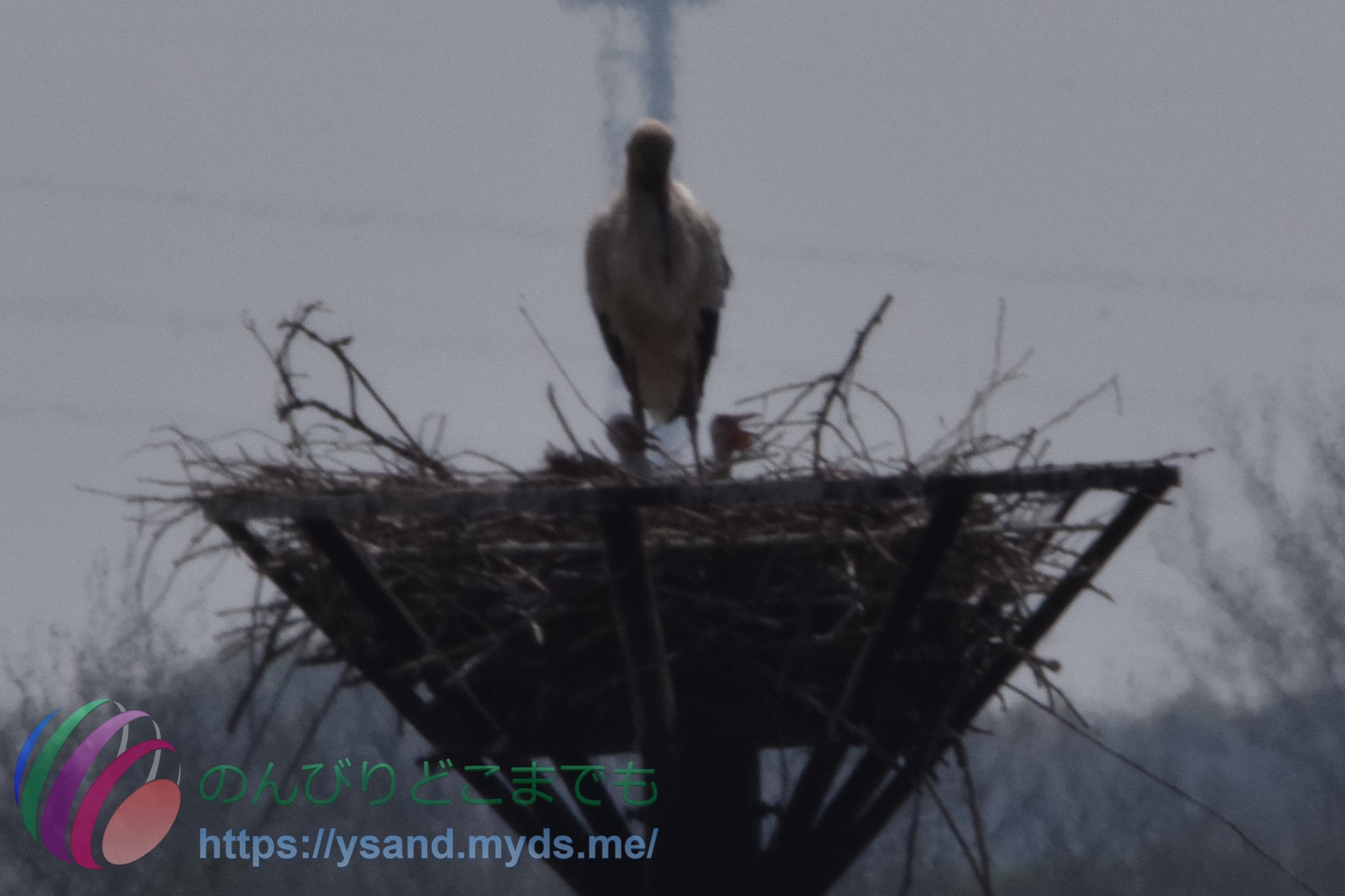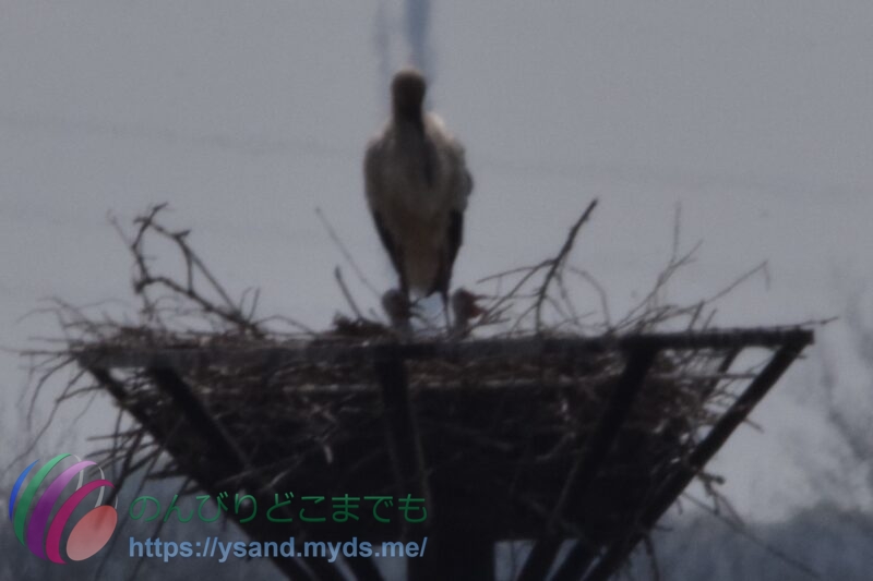 一番上の写真がオリジナルのサイズですが、トリミングしてみると案外しっかりと2羽の赤ちゃんコウノトリが写っていますね。