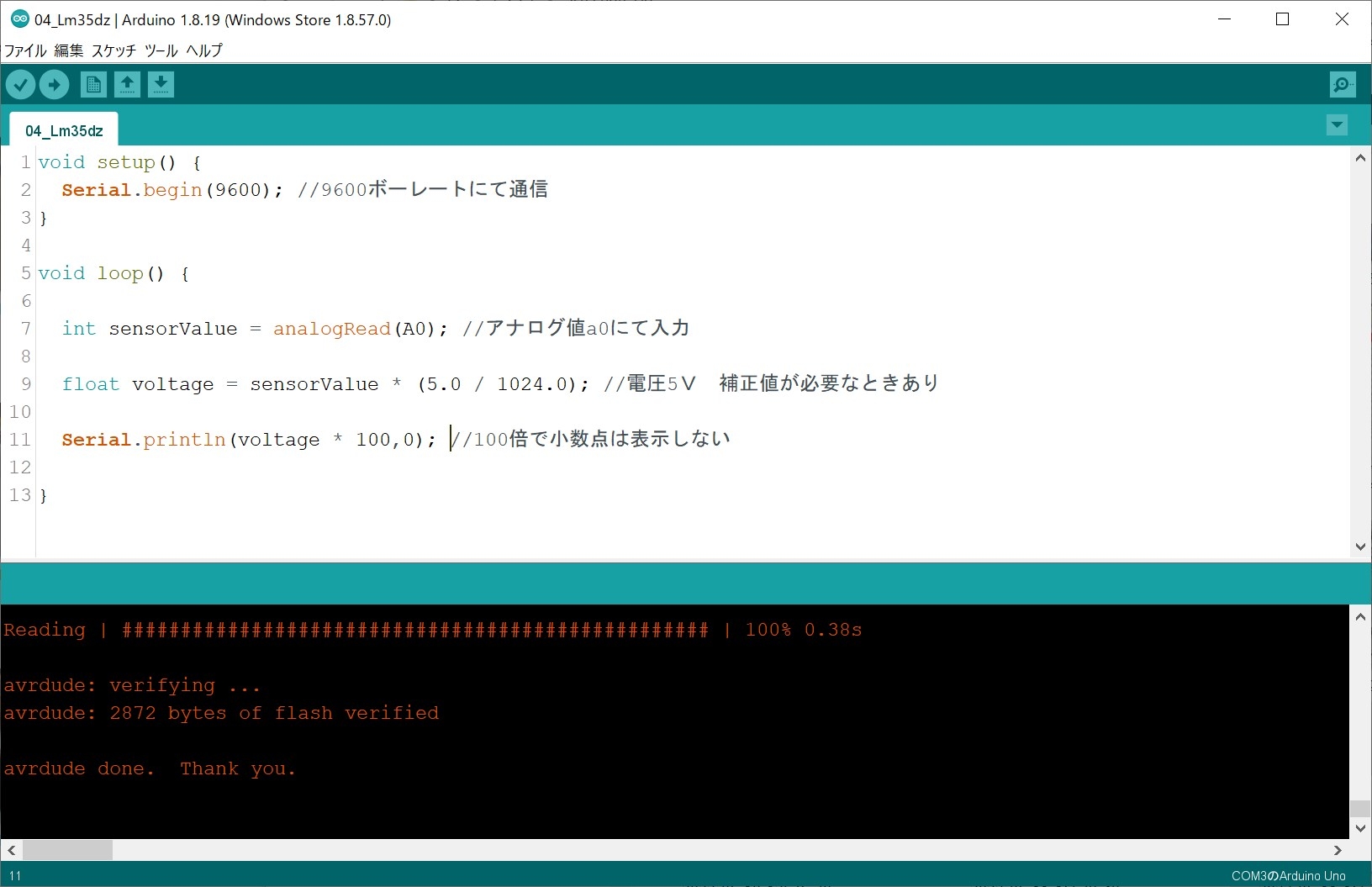 float voltage = sensorValue * (5.0 / 1024.0); //電圧5V 補正値が必要なときあり