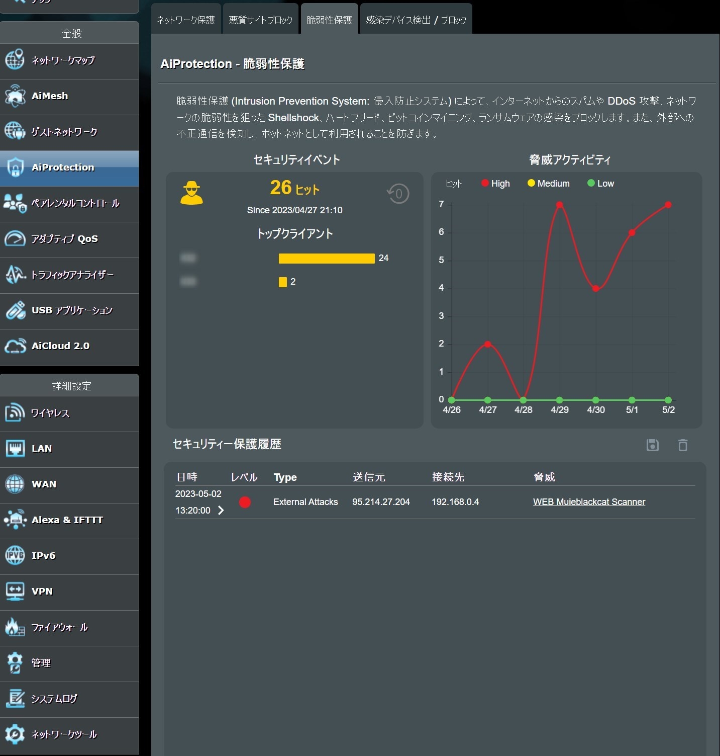 AiProtectionというセキュリティのところで、脆弱性保護が働いているようです。