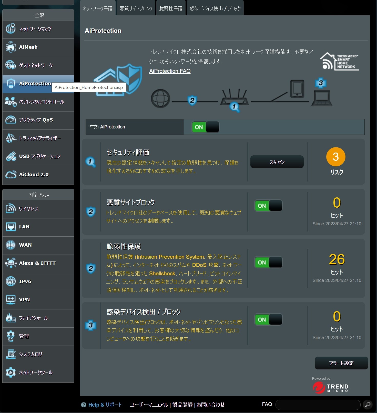 AiProtectionというセキュリティのところで、脆弱性保護が働いているようです。