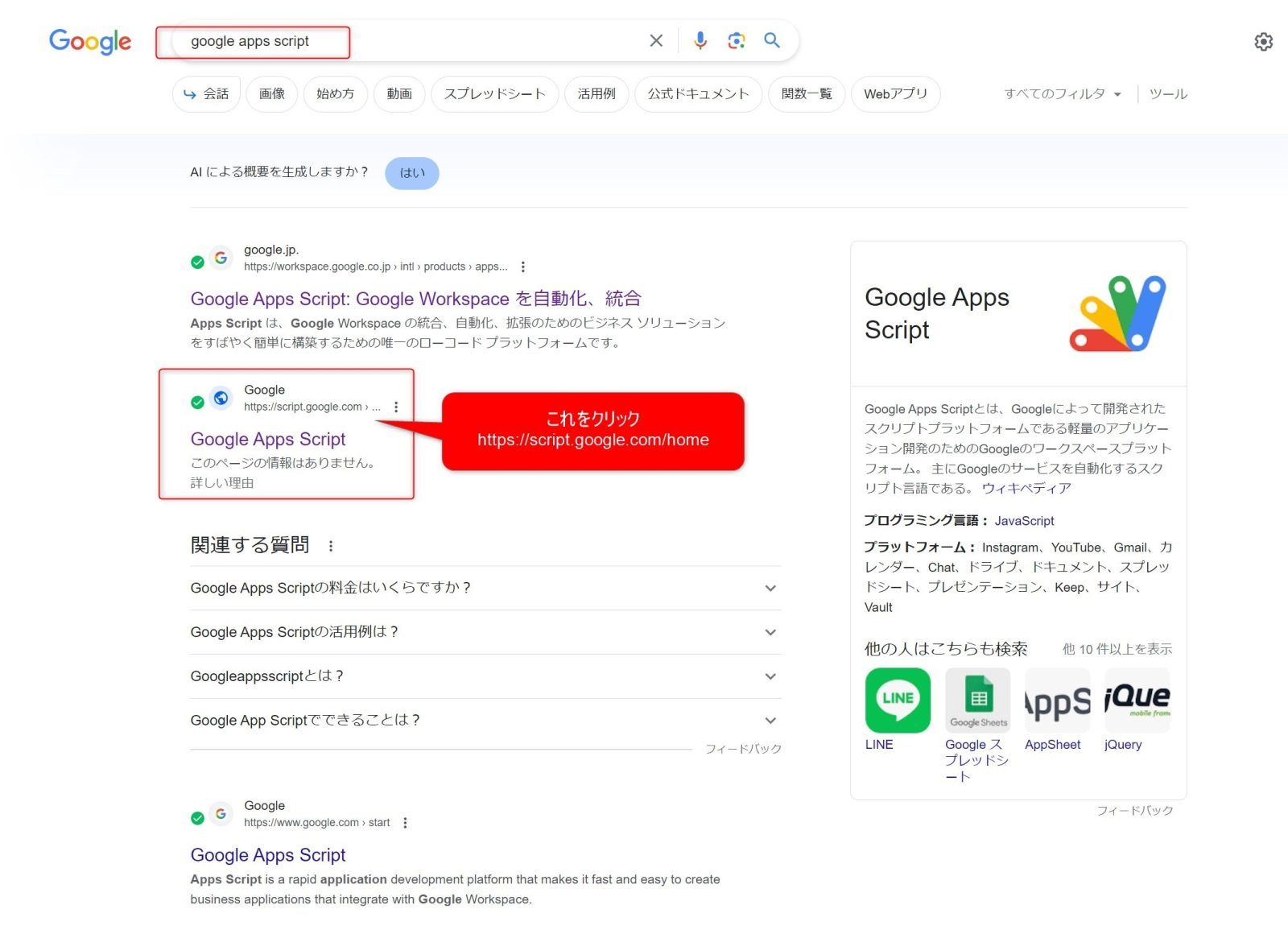 「google apps script」で検索した場合は、以下の検索結果画面から飛ぶといいです。↓