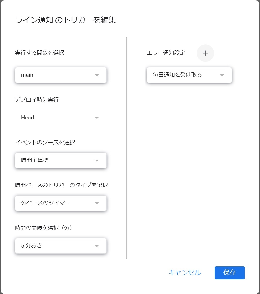 5分毎にこのスクリプトを走らせたいので、時間主導型を選択して、上図のようにします。