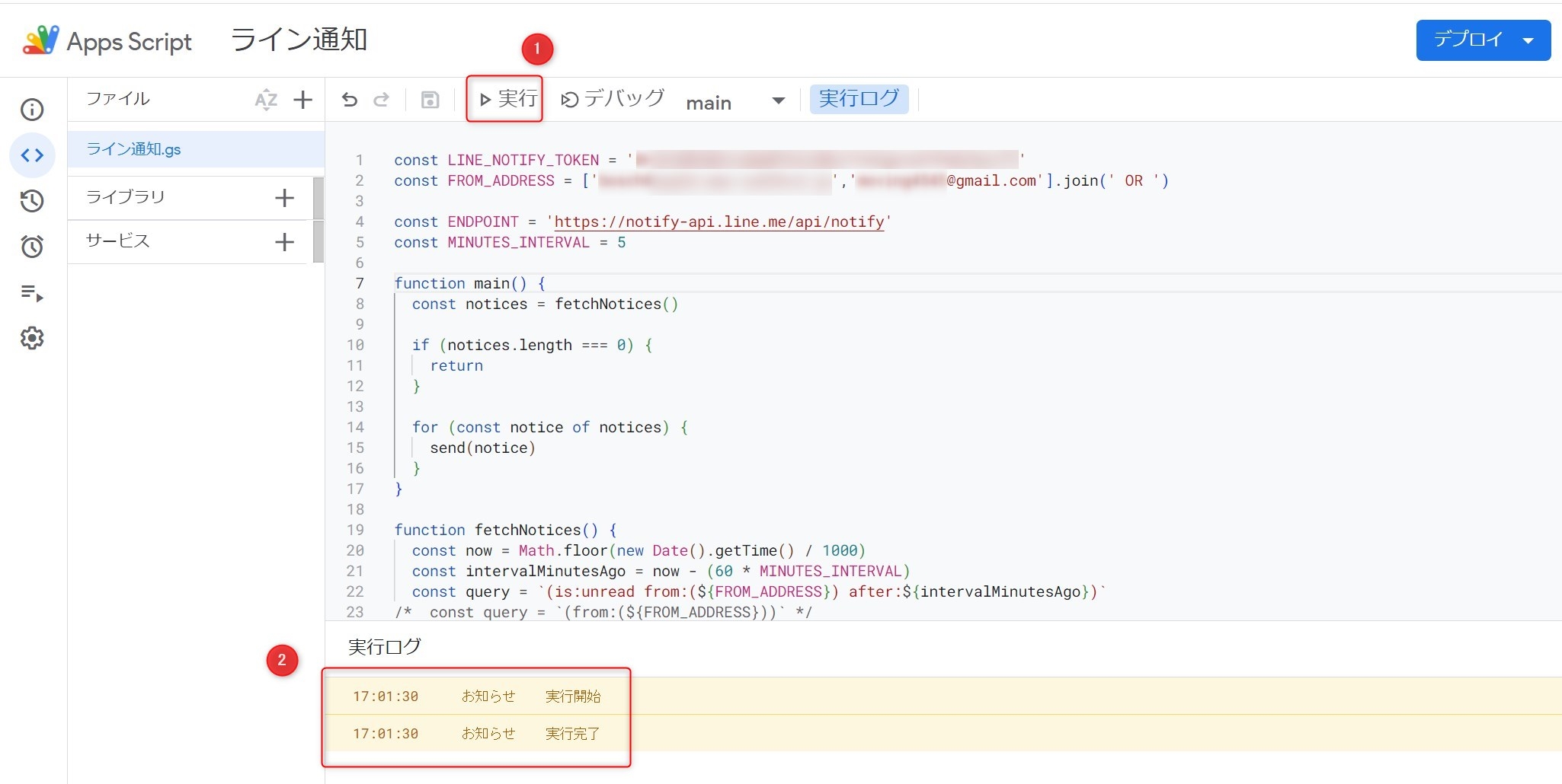 赤丸①の実行を押して、赤丸②のようなログが出れば、成功してLine Notifyへ通知が来ます。