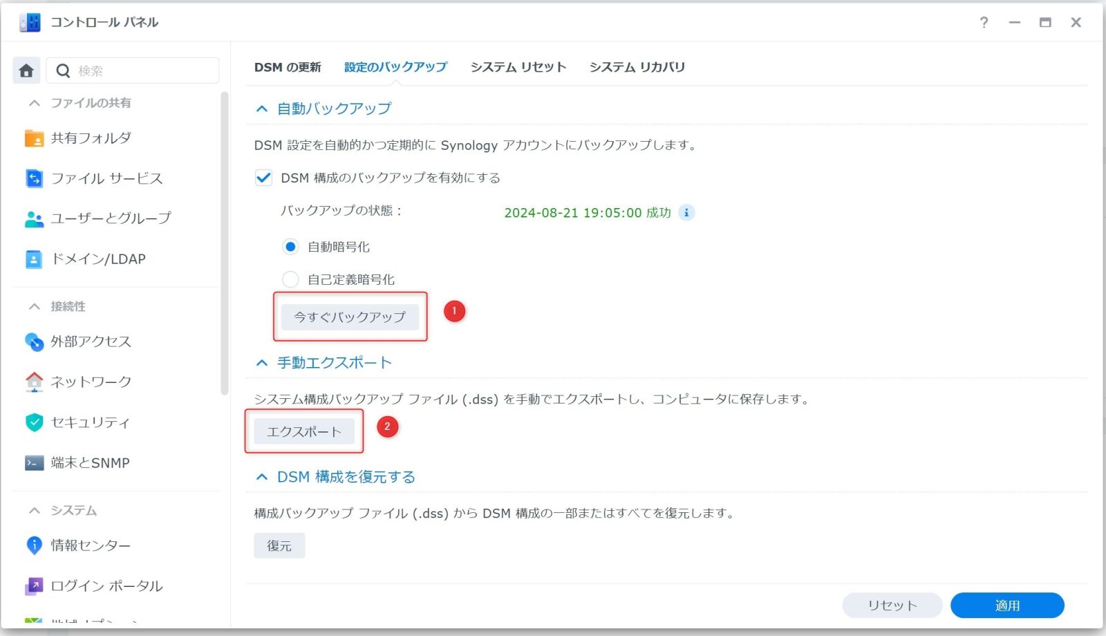 そして、下図②の「エクスポート」を押して、自分のPCに構成情報をエクスポートします。(これを後ほど利用しますので、注意してください。)
