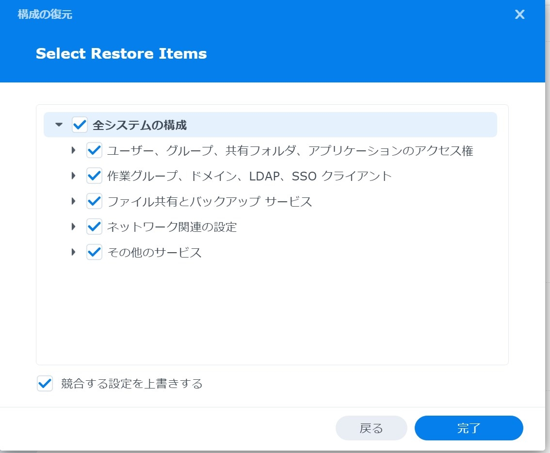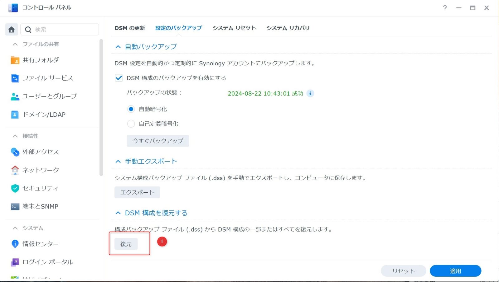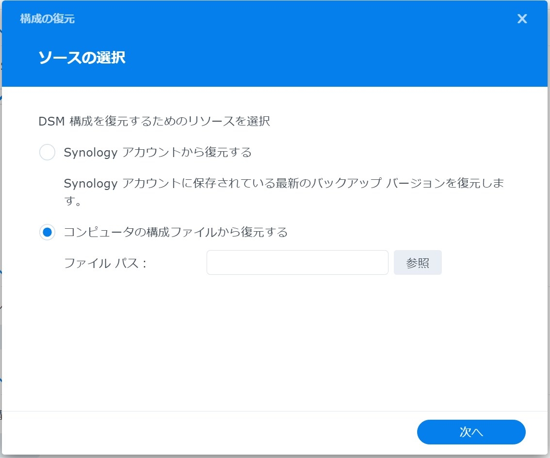 DSM7がインストールされたら、先のDSSファイルを使って構成を復元します。
