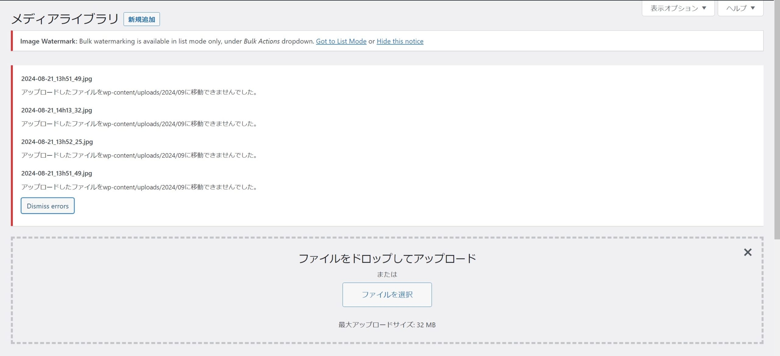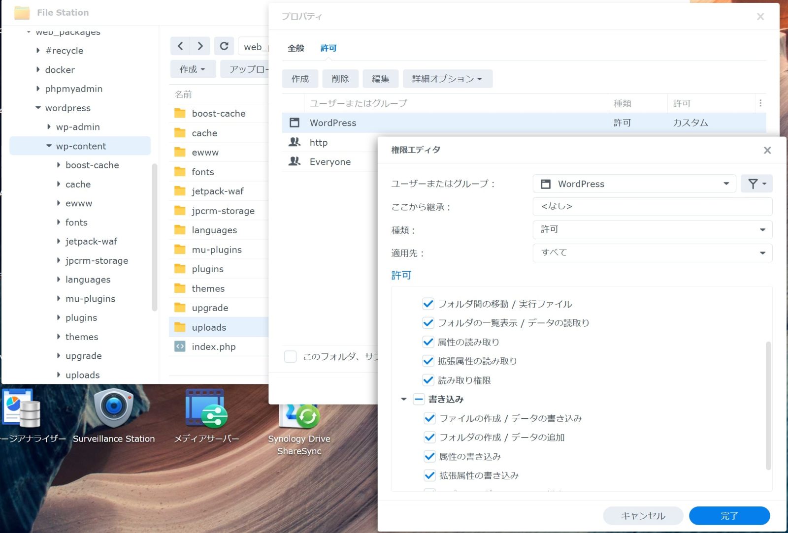 2.Wordpressで、写真などのメディアが新規アップロードできなかった。→フォルダのアクセス権限がなぜか不備だった。