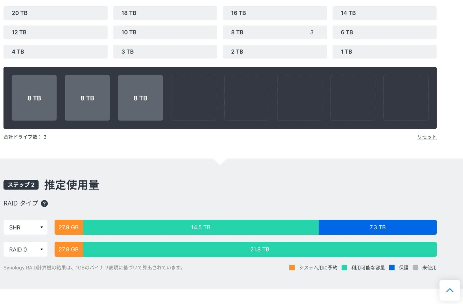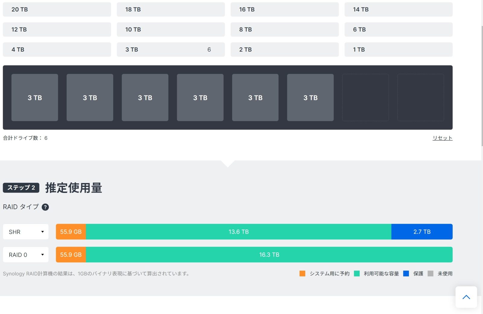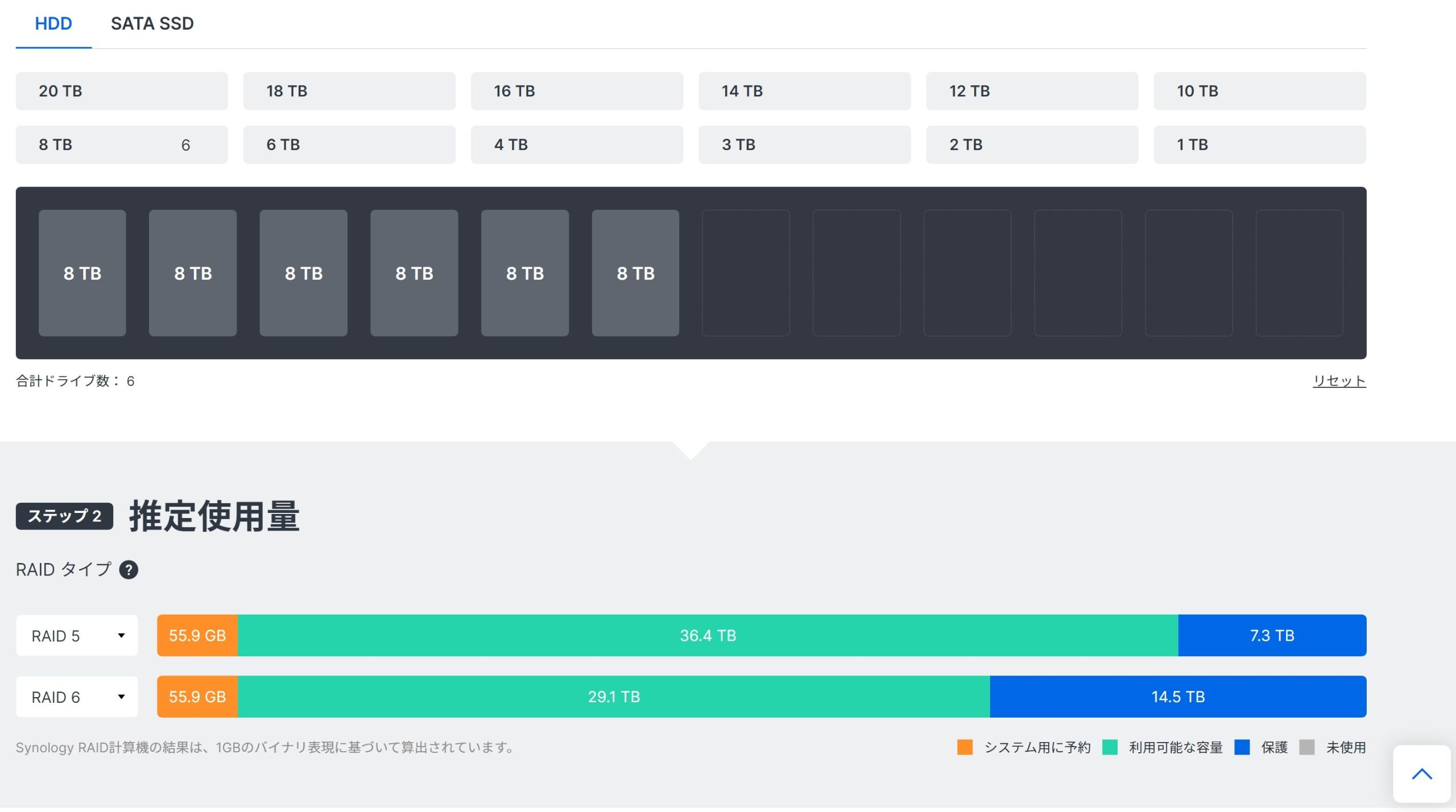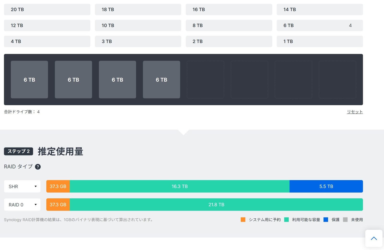 さて、いくつの容量にしようかと考えていると、SynologyのサイトにRAID計算機というサイトがあります。↓