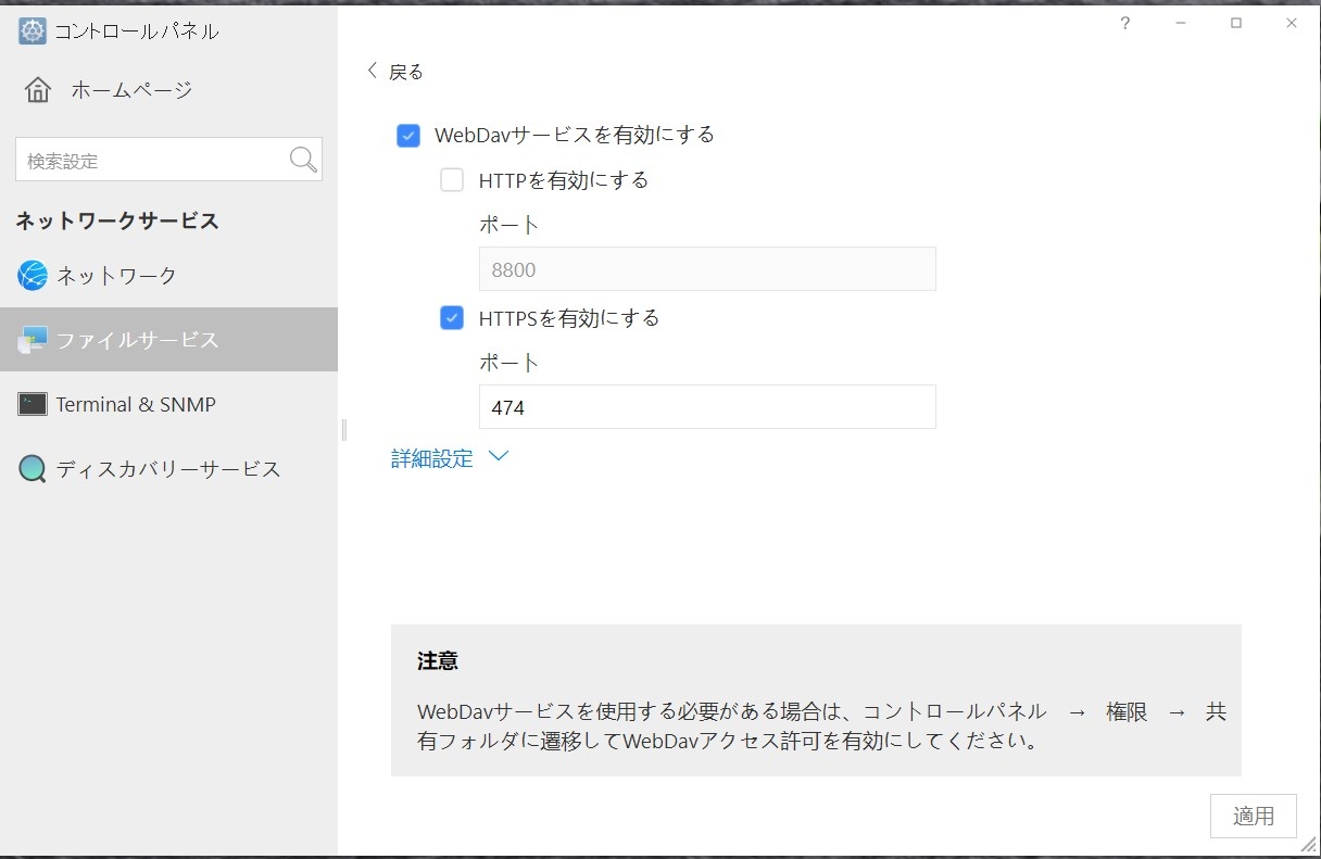 コントロールパネル→ファイルサービス→WebDevを開きます。