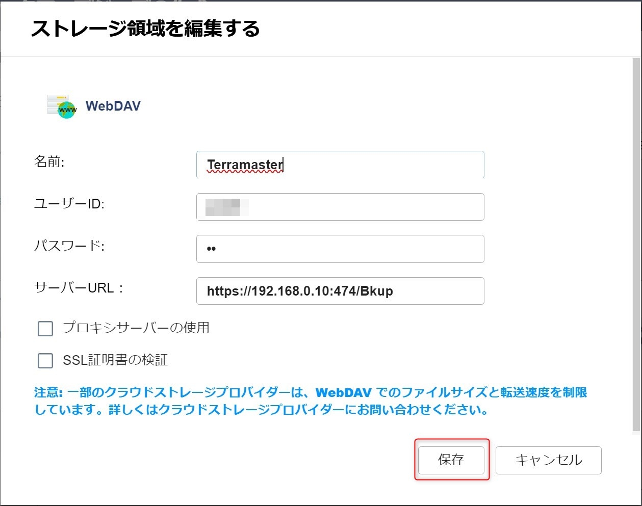 で、続いて、TerramasterのIPアドレス&ポート番号(192.168.0.10:474)を入力