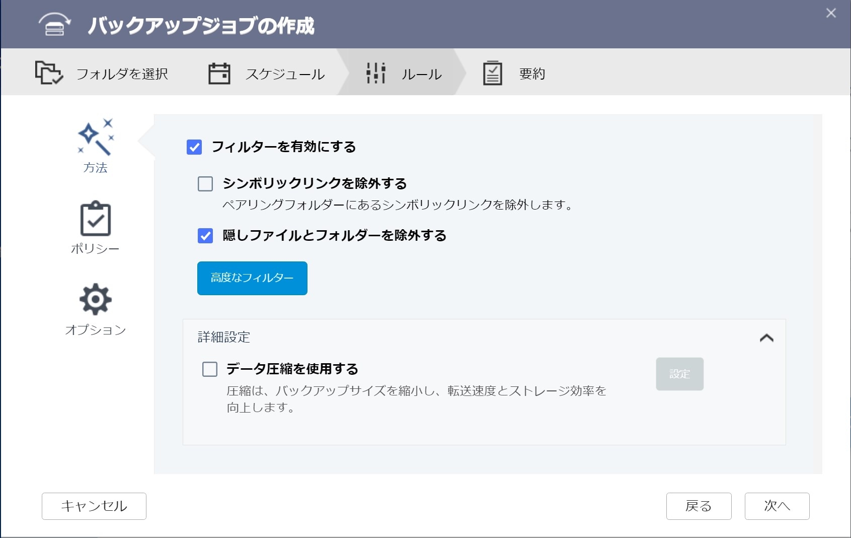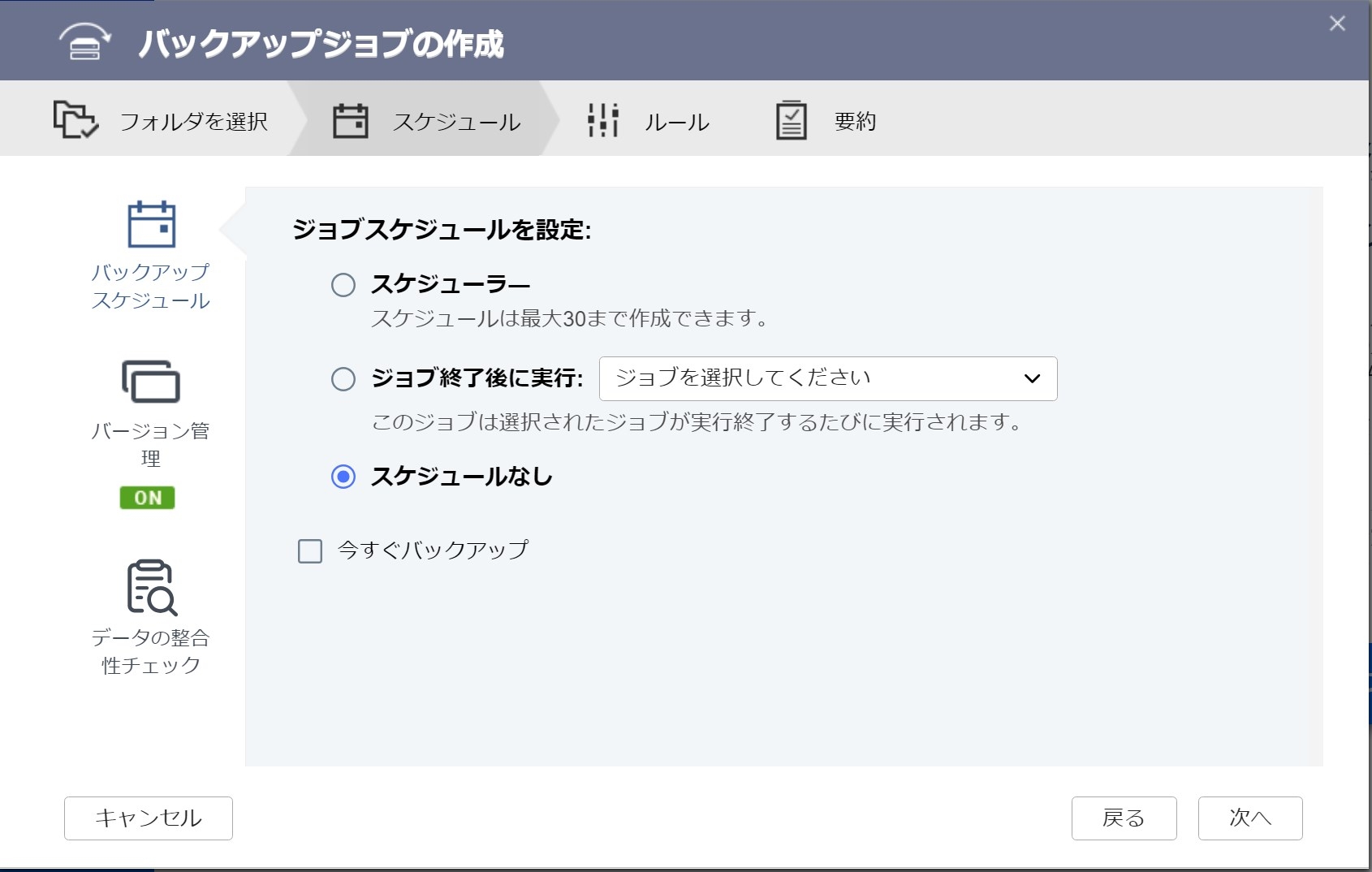 スケジュール設定ができますが、今回は1回目なので、スケジュールなしを選択して「次へ」です。