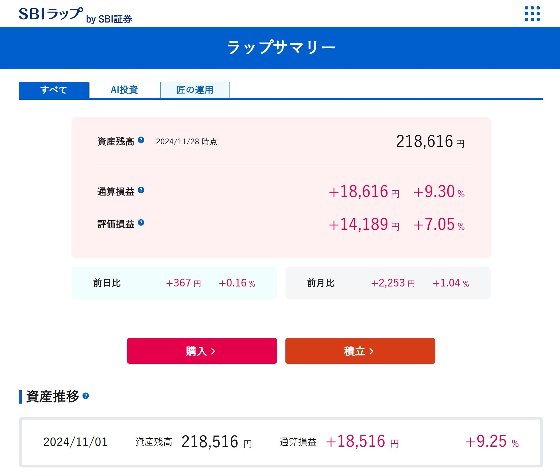 20万円を預けて、11月28日時点で、218,616円となり、利益は18,616円の利益となっています。
