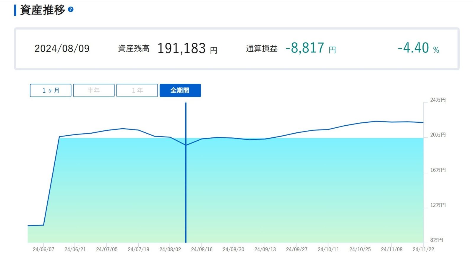 ところで、8月に株式はガクンと落ち込んだのですけど、その影響はどの程度だったのかグラフで見てみましょう。