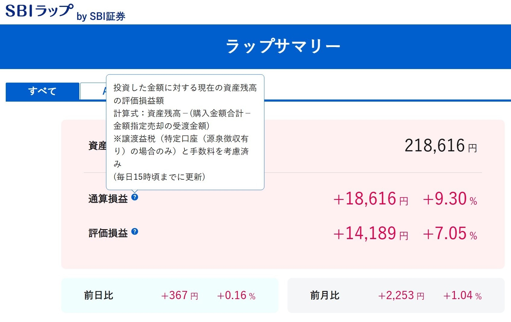 投資した金額に対する現在の資産残高の評価損益額
