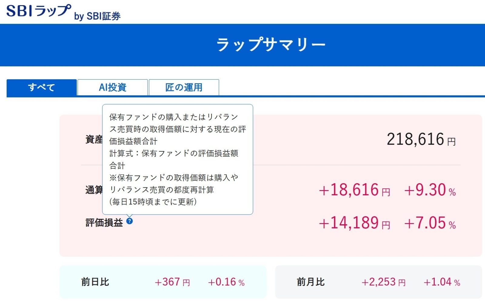 保有ファンドの購入またはリバランス売買時の取得価額に対する現在の評価損益額合計