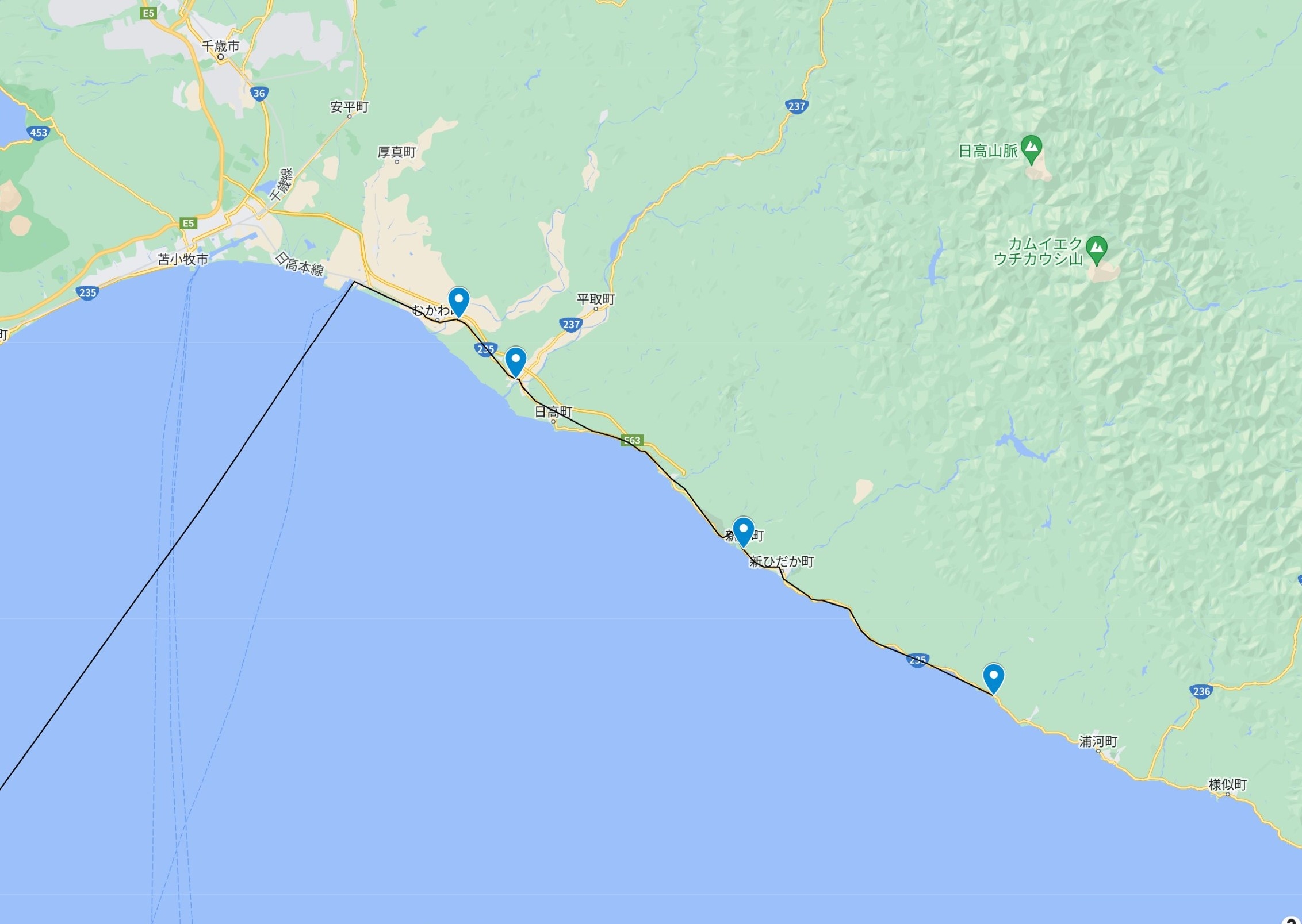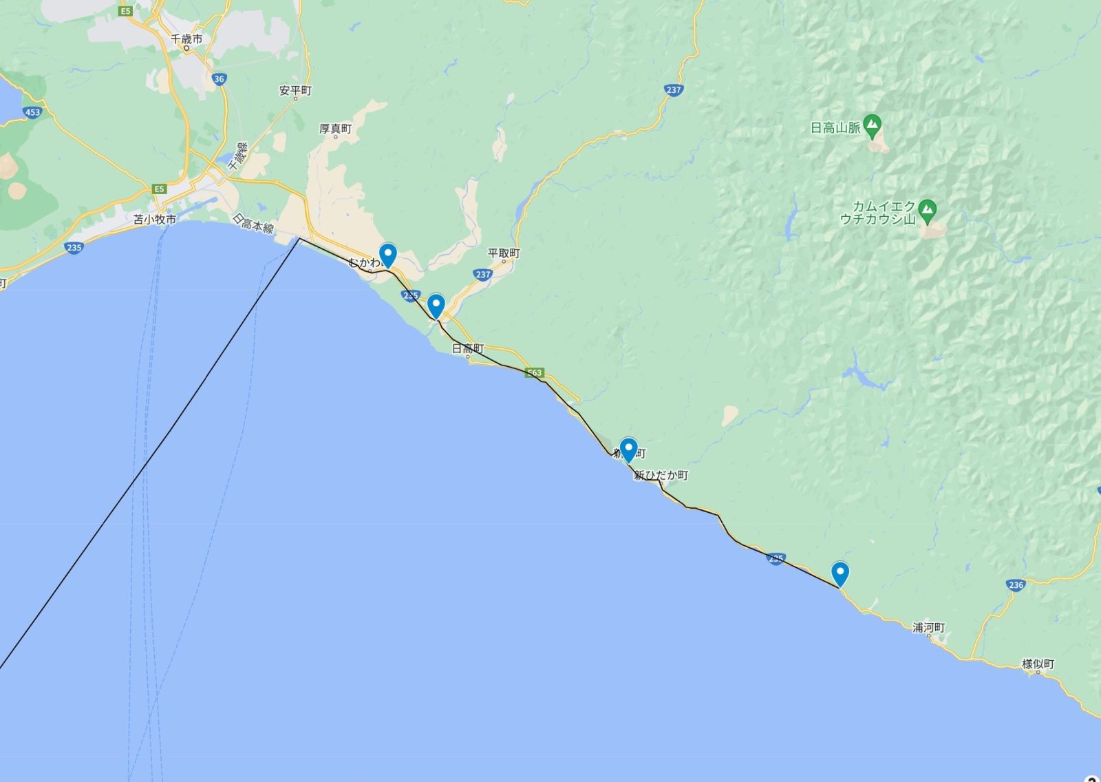北海道へ上陸して、日高、襟裳岬方向へ向かいます。