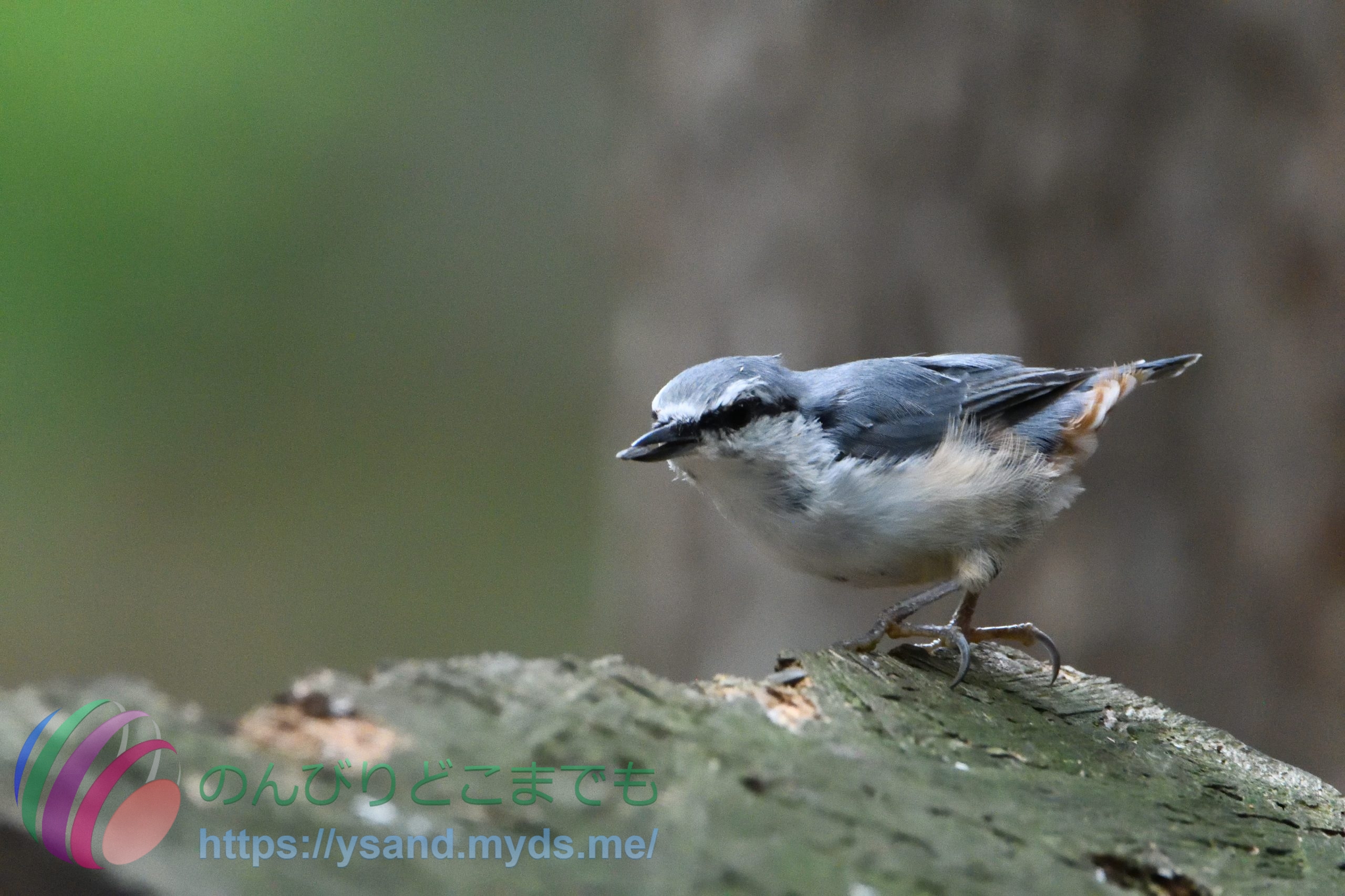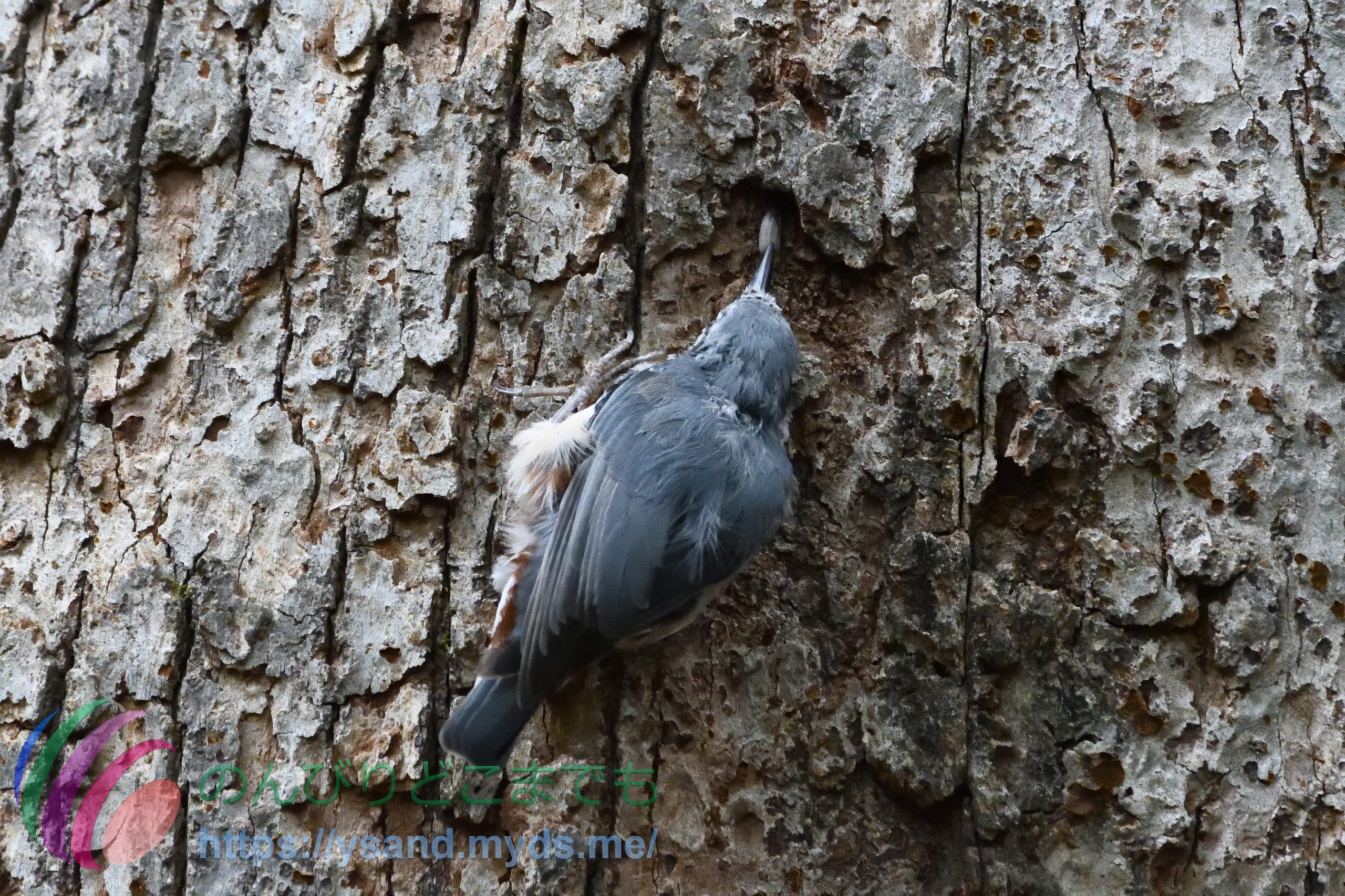 ゴジュウカラちゃんを観察していると、エサ台↑から、餌を咥えて↓木の間に餌を隠している行動をしていました。