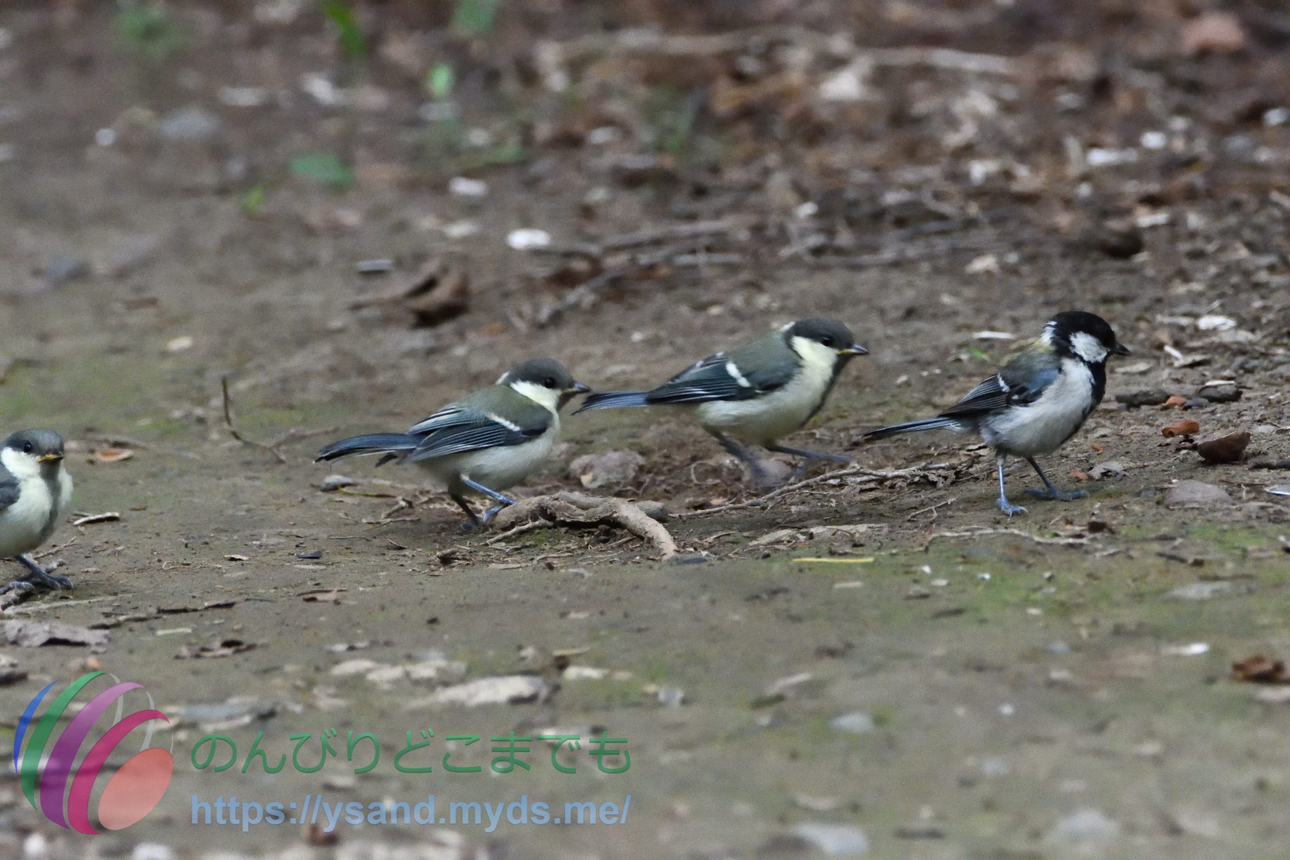 ↑ 一番右のシジュウカラが親だと思います。残り三羽が子供でついて歩いている様子ですね。