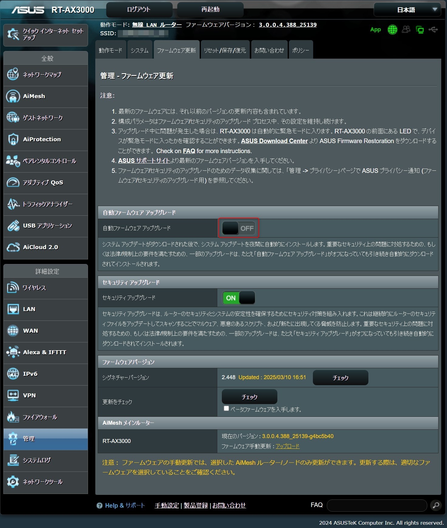 なので、「自動ファームウェア アップグレード」はオフにする。